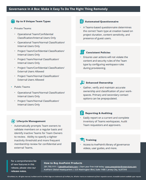 With the AvePoint Cloud Governance solution, you have the ability to provide your employees with a request within Teams. Using predefined templates, end users can easily create teams themselves when they need them, but this creation is done within policies that you and your organization set. An approval process allows you to determine when IT needs to intervene, for example to approve a request. By giving your end users as much responsibility as possible, you save IT a lot of time and increase their efficiency.