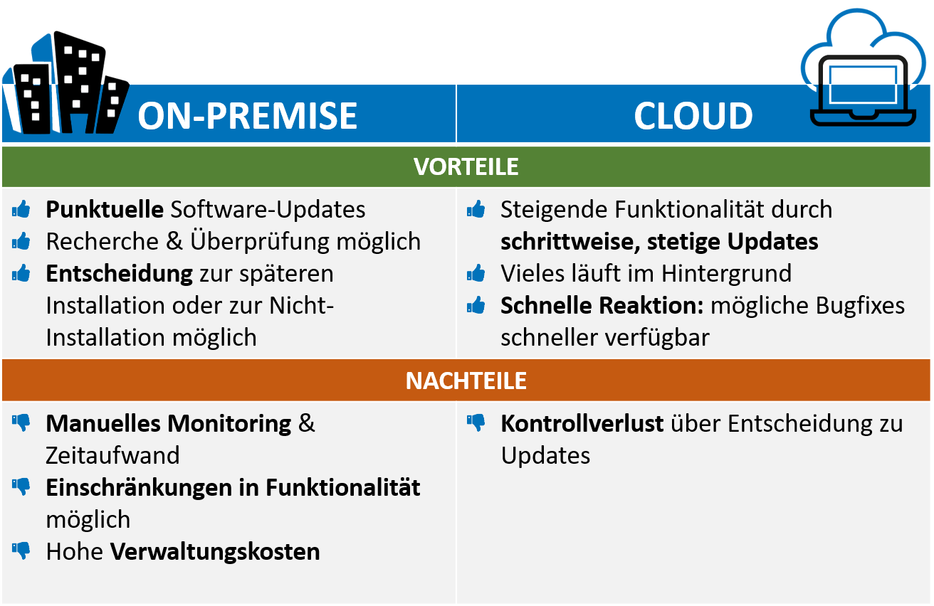A brief digression into software history: on-premise solutions (i.e. those that are stored on internal or external servers) contain permanently installed software components. Until a few years ago, it was therefore common practice to carry out software updates in a bundle at a time that was convenient for the company.