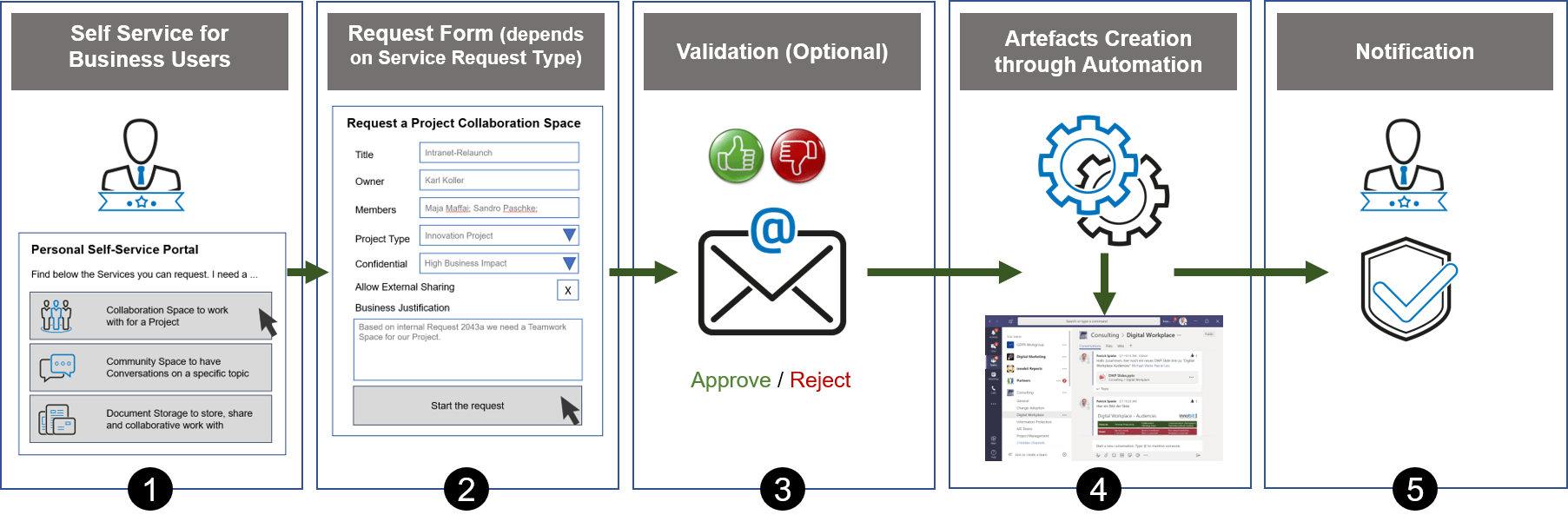 The company "Think&Act" relies on a process that summarizes everything important from the self-service order to approval and creation. The user is guided and does not have to worry about which template is the right one for their use case.